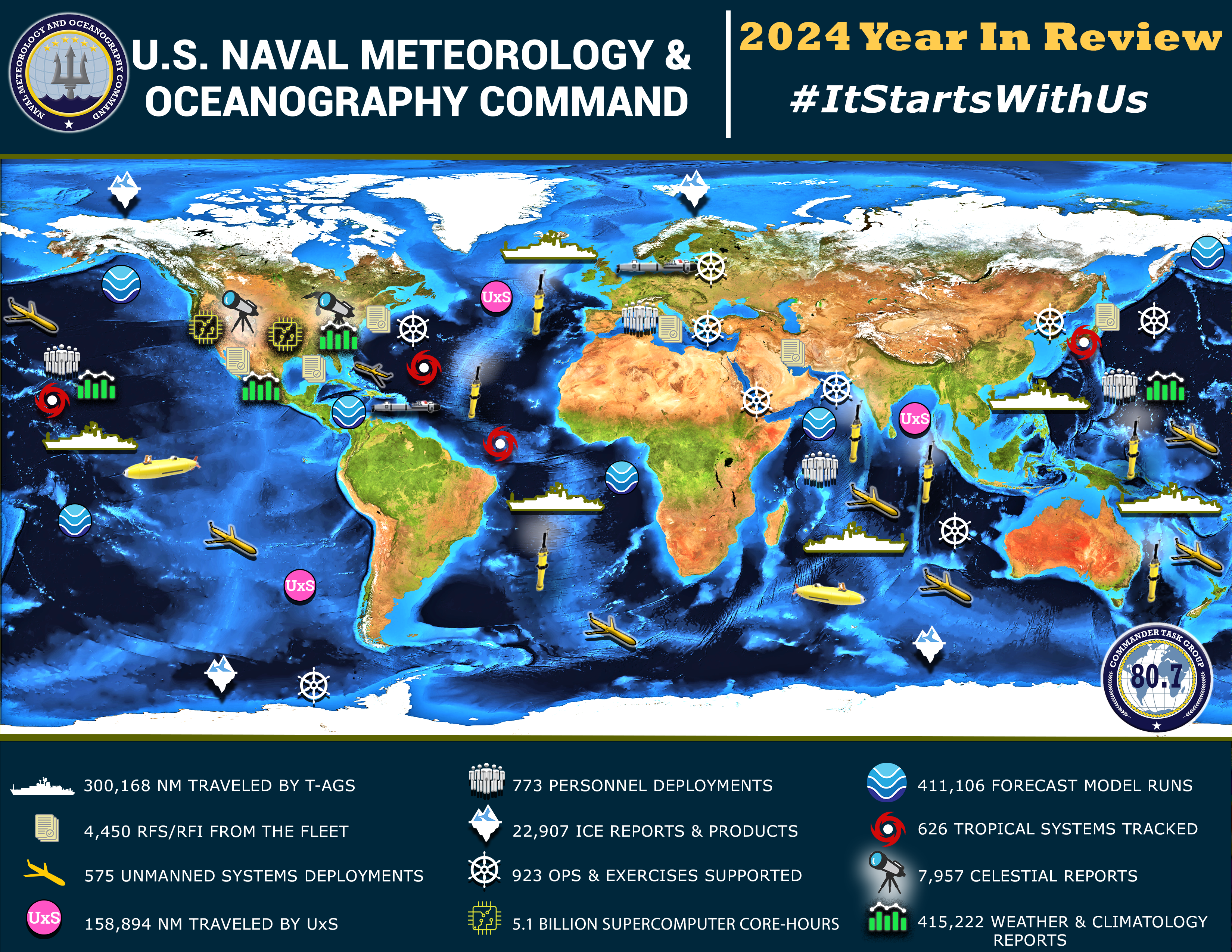Recently, U.S. Naval Meteorology and Oceanography Command’s (Naval Oceanography) Joint Typhoon Warning Center (JTWC) tracked Super Typhoon 02W (MAWAR) through the Western Pacific as the storm reached historic proportions. MAWAR’s peak intensity was reported to have reached upwards of 160ktnots (184 mph). In times of severe and impactful weather hazards due to tropical cyclones, JTWC plays a vital role in protecting the Navy; Ships and Sailors alike.